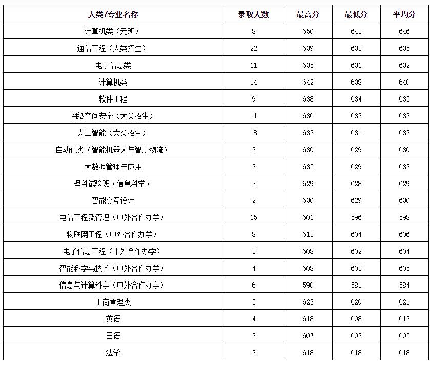 北京邮电大学2022年在山东专业录取分数线: