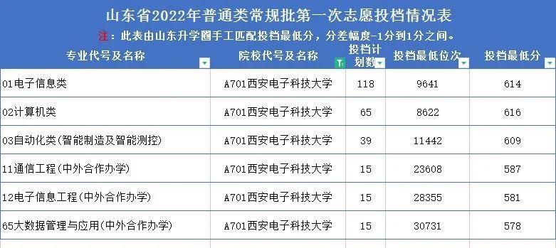 西安电子科技大学2022年在山东专业录取分数线: