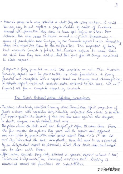 Facebook的安全部门根据泰勒,奥斯汀,爱丽丝等等用户的资料和IP地址追踪到一个远在荷兰的人。荷兰警方派警员假扮成未成年少女与此人在网上聊天套取信息,之后黑进他的电脑,在其中找到相当多他勒索阿曼达的记录,而更可怕的是,他的受害者远不止阿曼达一人,而是有超过一百人。