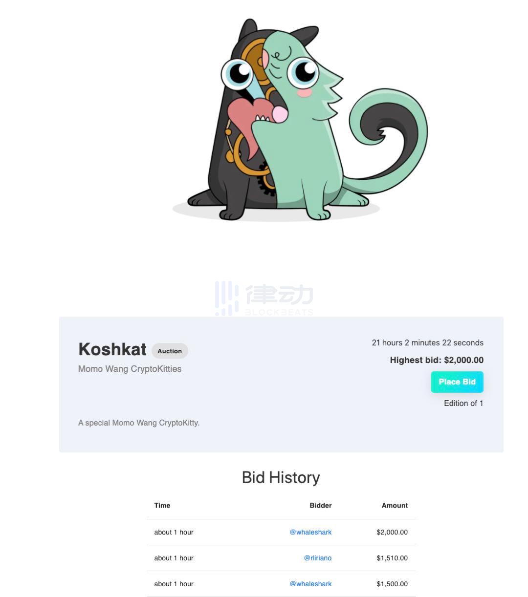 当然第一只只是开胃菜,限量 100 只怎么看还是有点多,重头戏还是在 Koshkat,存世量只有一只。0 元起拍价高者得,规则明明白白。
