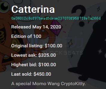 首款 CryptoKitty Catterina 是特别版,即图中左边那只,限量发行 100 只,每只初始定价为 100 美元。全部拍出后会拍卖右边这只 Momo Wang Exclusive。