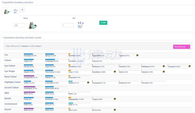 因此引入了 WCK 的概念,一只加密猫等于一枚 WCK,每只加密猫的生产成本约为 0.008 ETH,规则如下:
