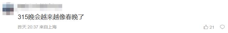 很多人吐槽说,315晚会越来越像“春晚”,“315”不见了,就只剩“晚会”了。