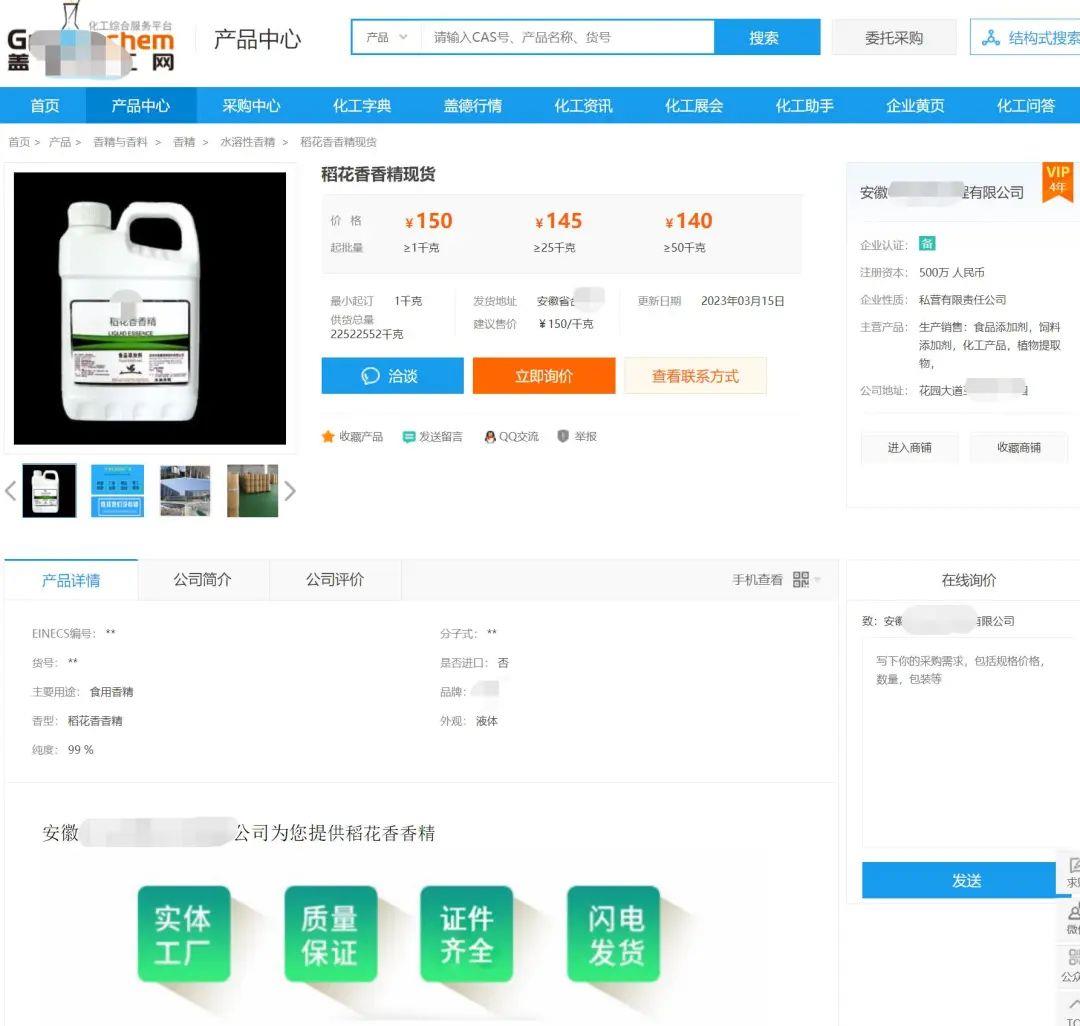 不仅如此,就是此时此刻也依然能查到某化工网还在售卖安徽某生物工程有限公司生产的稻花香香精现货。