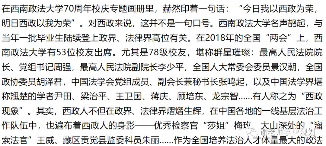 西南政法大学,简称“西政”,“五院四系”成员,位于重庆市,是教育部与重庆市人民政府共建高校,新中国最早建立的政法类高等学府,1978年被国务院批准为首批全国重点大学,也是司法部部属政法院校中唯一的重点大学。在法学界,西政的地位相当高,在第四轮学科评估中,它的法学获评A,建校以来,学校为国家培养了各级各类人才近30万,是全国培养法治专门人才最多的高校。在中国法律界有一半的法学人才都是西南政法大学的毕业生,甚至在最高法院也有近50%的人都来自西南政法大学。因此,西南政法大学被称为中国法学教育的“黄埔军校”。西南政法大学在河北的录取分数也在持续走高,2023在河北物理组招收的4个专业录取位次均在1万名以内,历史组最高录取位次达到了600多位。2022年西南政法大学的本科升学率31%。