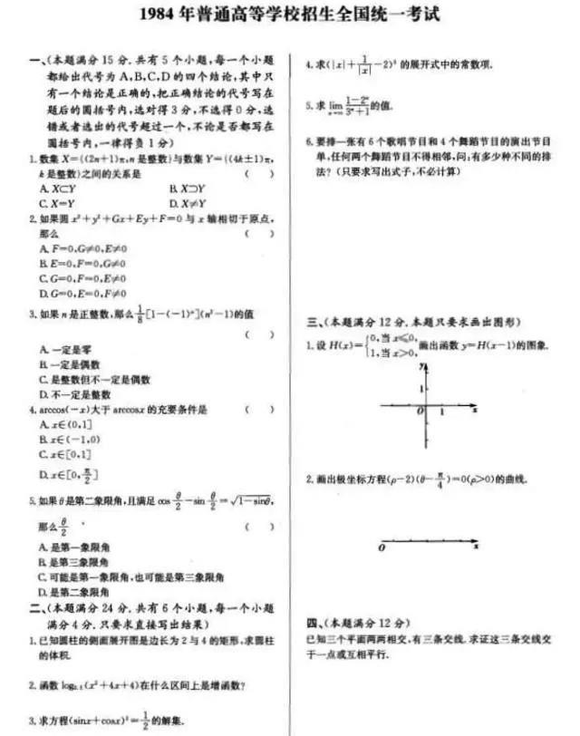 据说,1984年的高考数学题是迄今为止,中国高考史上的最难数学考题;平均分只有26分,也是中国高考史上数学的最低平均分。