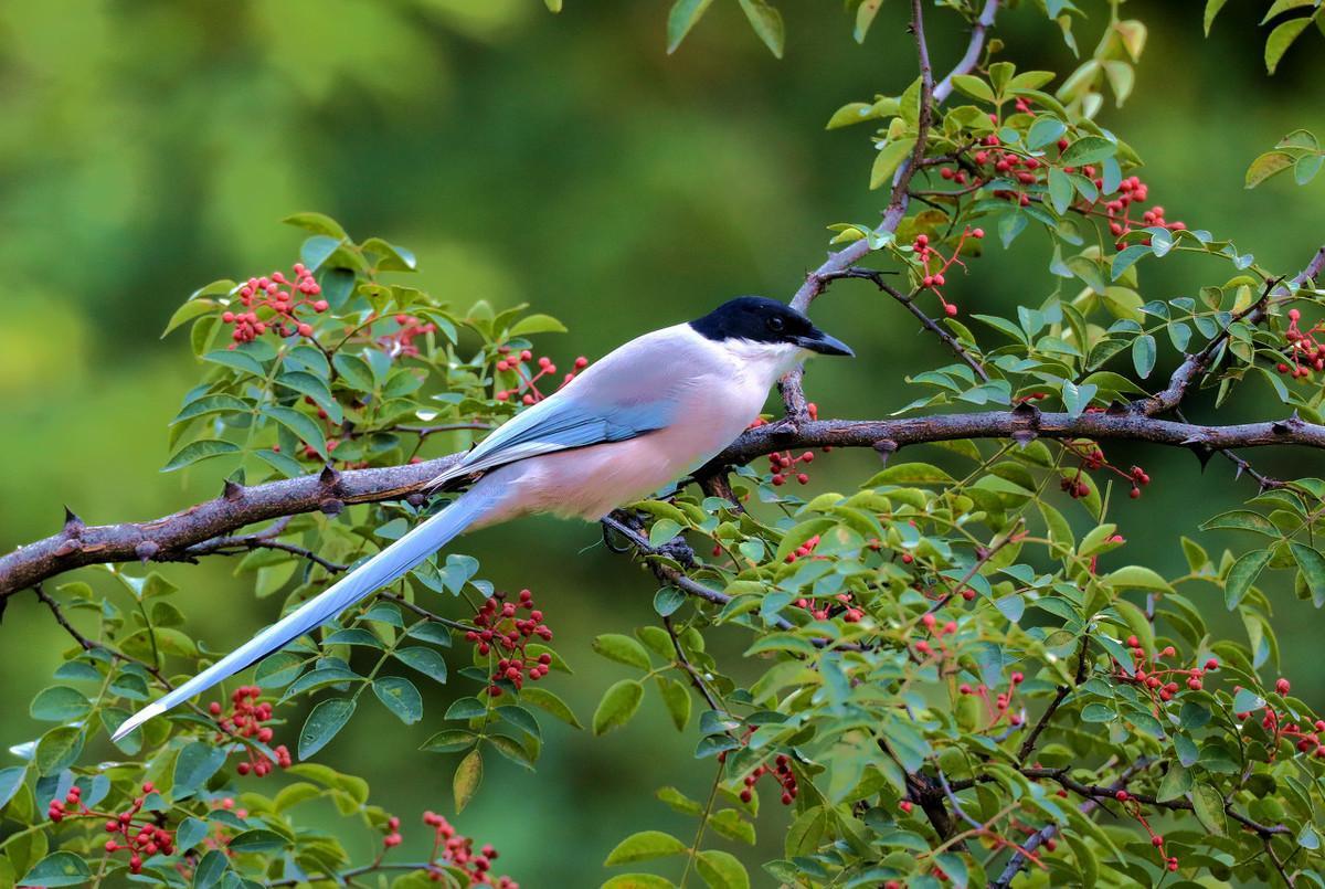 灰喜鹊(学名:Cyanopica cyanus):属雀形目、鸦科的中型鸟类。外形酷似喜鹊,但稍小。体长33-40厘米。嘴、脚黑色,额至后颈黑色,背灰色,两翅和尾灰蓝色,初级飞羽外翈端部白色。尾长、呈凸状具白色端斑,下体灰白色。外侧尾羽较短不及中央尾羽之半。