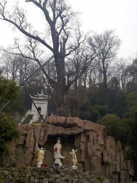 送子观音,它在左边小路往上走的半路上,面前是一汪清池,里面有荷花,夏天可以看到荷花随风摇曳,为行人在炎热的夏天送上清凉。