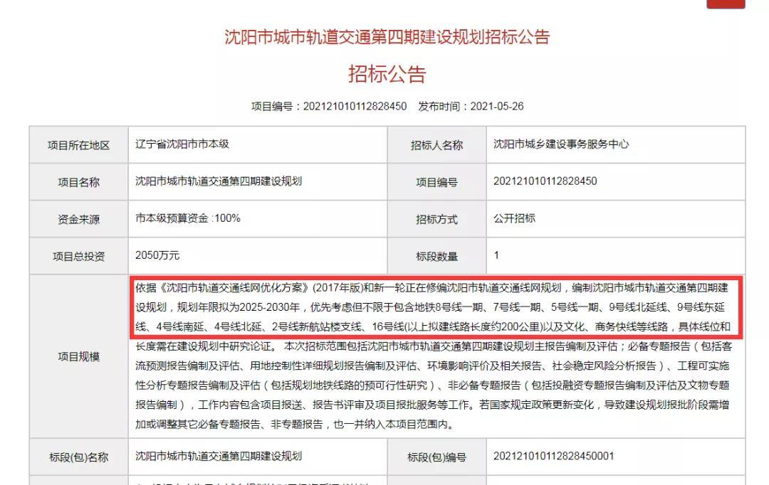 5月26日,《沈阳市城市轨道交通第四期建设规划招标公告》重磅发布,2025-2030年,总里程约200公里的地铁线路即将开建!在公告中可以看到地铁8号线、7号线、5号线、9号线北延线、9号线东延线、4号线南延、4号线北延、2号线新航站楼支线、以及16号线均有涉及。