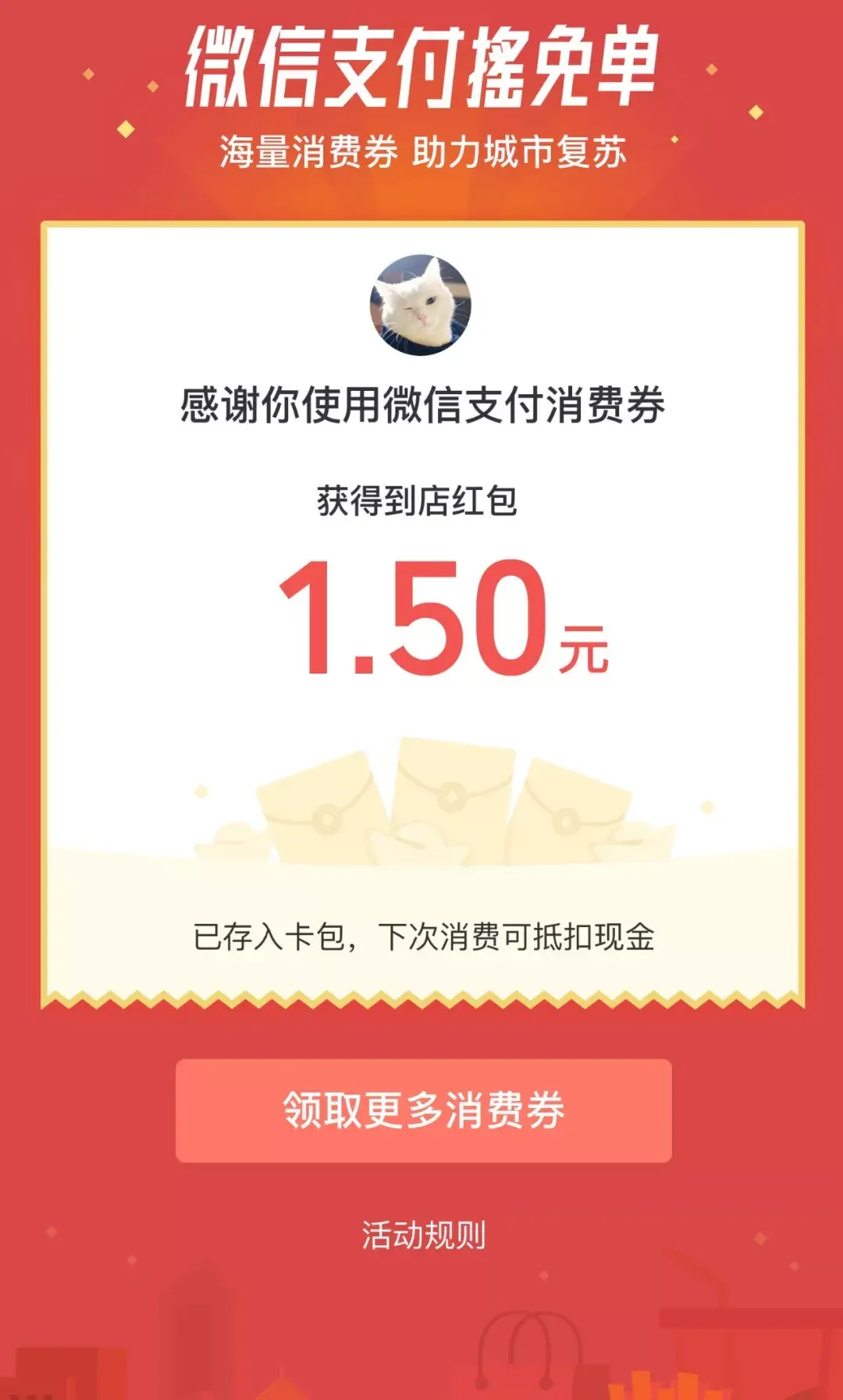 获得免单奖励就意味着这笔已支付款项,将立即返还至你的微信支付“零钱”账户。一次没摇到也没关系,除了免单大奖还有机会获得到店红包,每天3次机会等着你。