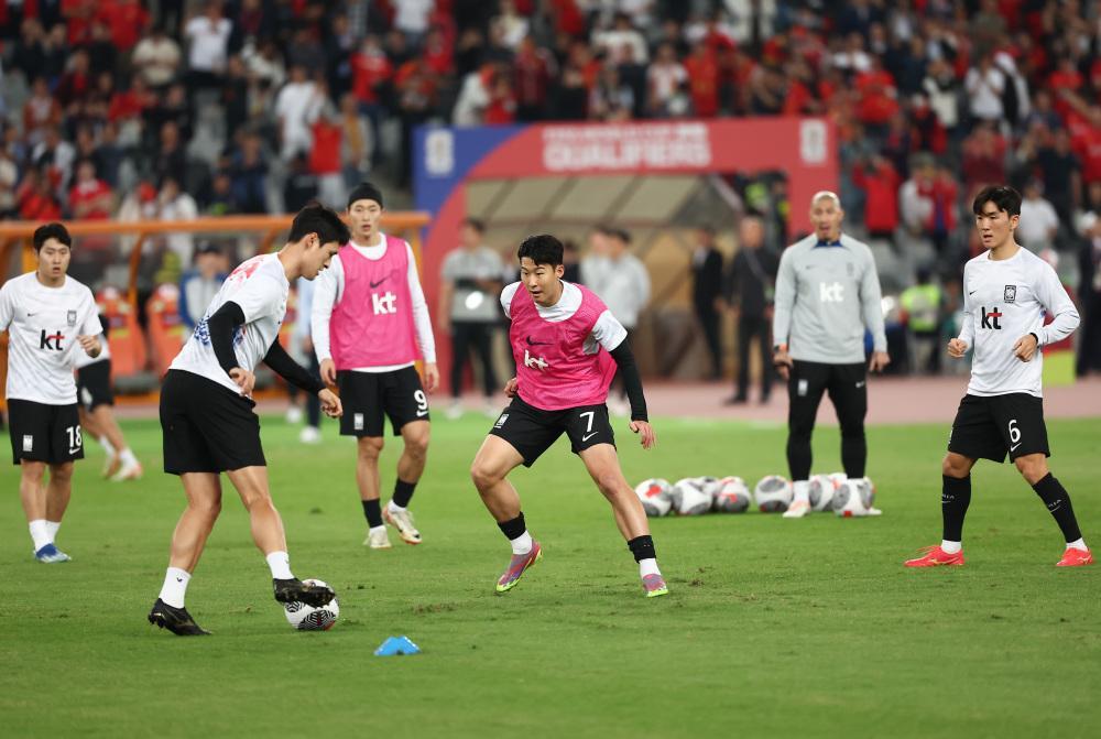 11月21日,韩国队球员孙兴慜(左四)在赛前与队友热身。