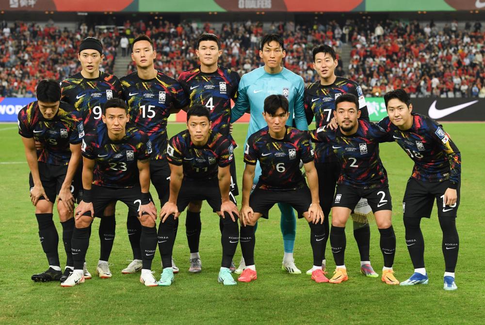 11月21日,韩国队首发球员在赛前合影。新华社记者 毛思倩 摄