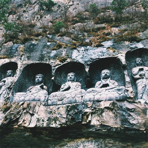 藏经阁路面装修的非常好看,逛完之后沿着后面阶梯可以直接走到下面的水部景观带,景区后面沿河山体上一路有很多石刻佛,一个挨着一个,水中也有躺着的弥勒佛和观音。