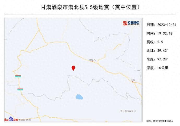 据中国地震台网正式测定:10月24日19时32分在甘肃酒泉市肃北县(北纬39.43度,东经97.28度)发生5.5级地震,震源深度10千米。