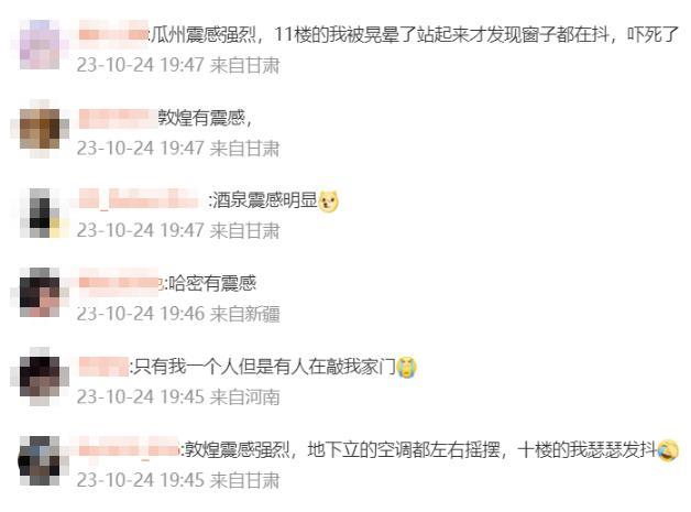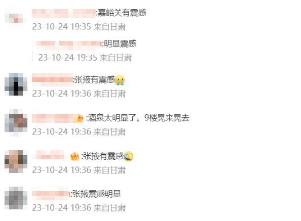 甘肃当地有网友留言称“震感强烈”“嘉峪关有震感”“张掖有震感”“酒泉太明显了,9楼晃来晃去”“11的我被晃晕了站起来才发现窗子都在抖”“地下立的空调都左右摇晃”……
