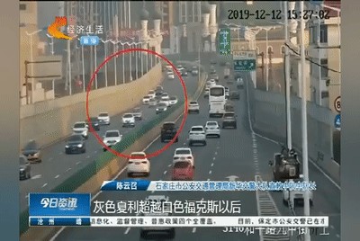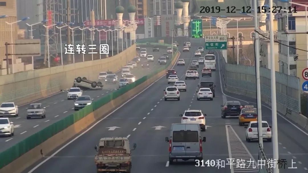12月12日15时27分,和平路高架桥北新街附近,由东向西行驶的车流中,灰色夏利车从中间车道并入左侧车道,在一辆白色福克斯车前行驶。变道后仅几秒钟,灰色夏利车再次超车,回到中间车道。而此时白色福克斯也跟了上来,试图超越灰色夏利。在超越没有完成的情况下,白色福克斯猛打了一把方向,致使灰色夏利猛地向右打方向,失控撞向右侧桥体又反弹回来,撞向了正常行驶的一辆白色尼桑越野车。