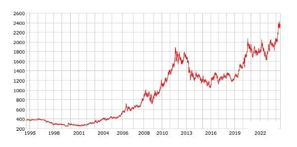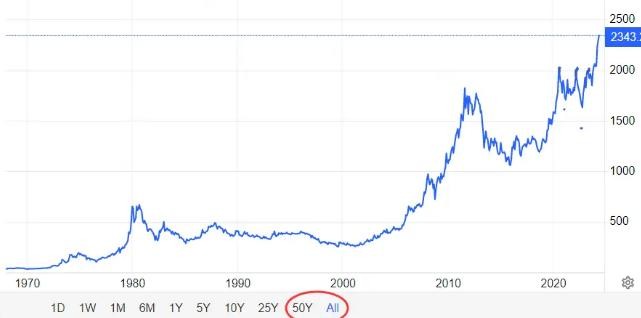 2、国际黄金价格五十年走势图(到2024年5月底)