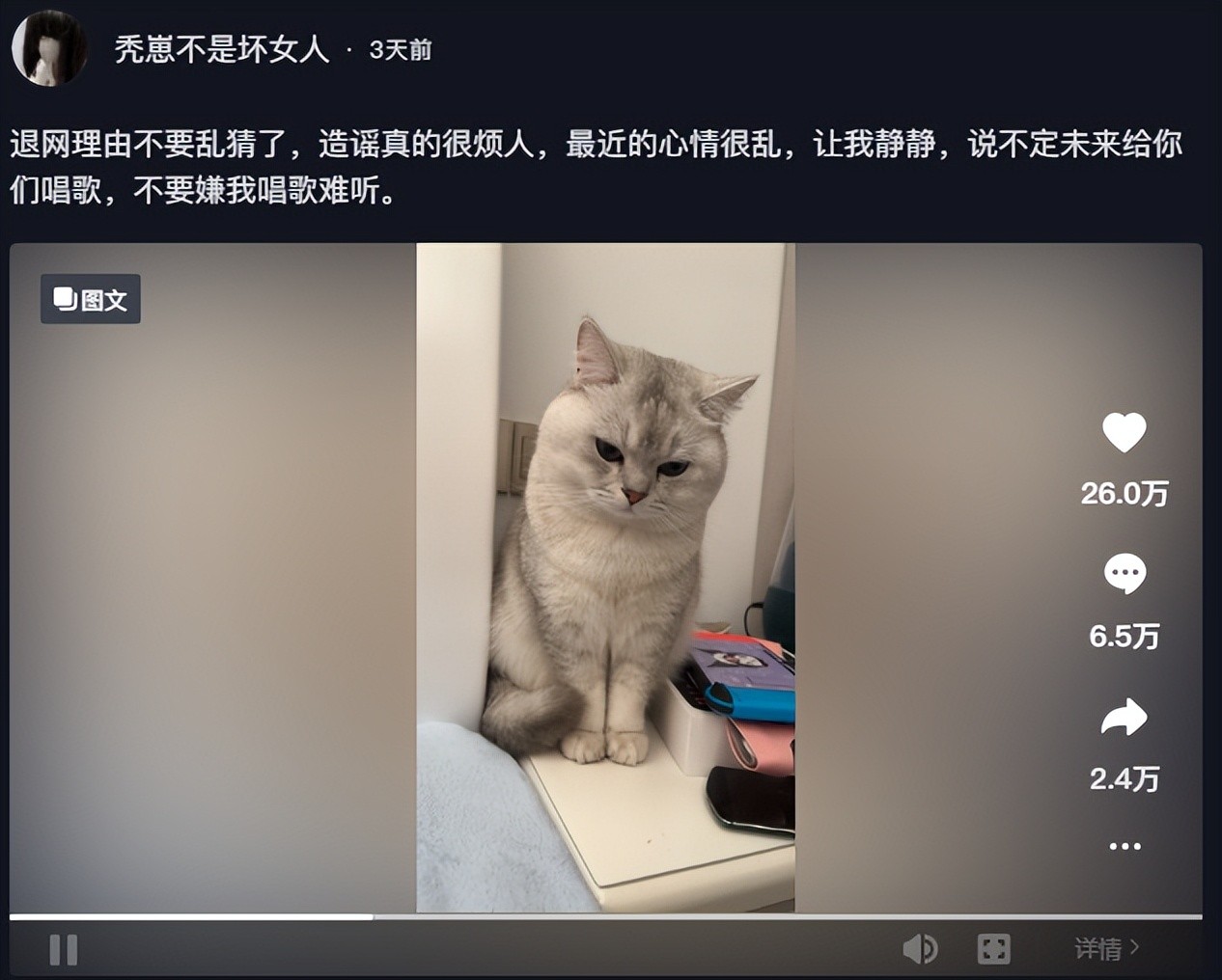 所以秃崽或许是冷静下来了,随后删除了 B 站退网动态,抖音也修改了退网的文案,或许意味着等她休息一段时间还会回来?