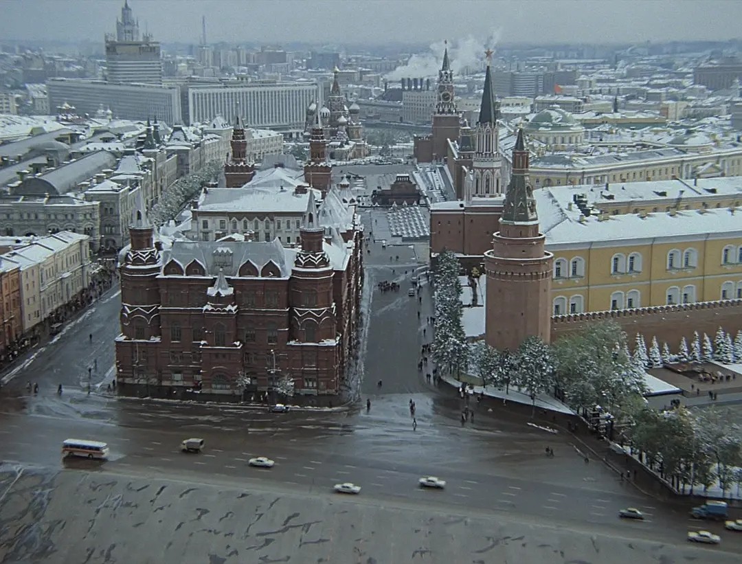 往往只有一首歌,或者一段音乐,配以大段街景,莫斯科喧嚣而生机勃勃的街头涌动人潮车流、银装素裹的城市雪景、肃穆的教堂,街头打雪仗的年轻人,还有积雪也无法掩盖的树梢上的小红果实……音乐随着镜头肆意流淌,含蓄冷静而又蕴含深情,在一个个心动的时刻,唤起心底潜藏的对平凡生活的温暖之爱。