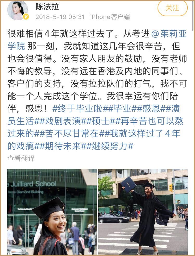 陈法拉宣布入学茱莉亚的那篇微博,至今还是她置顶的文章。
