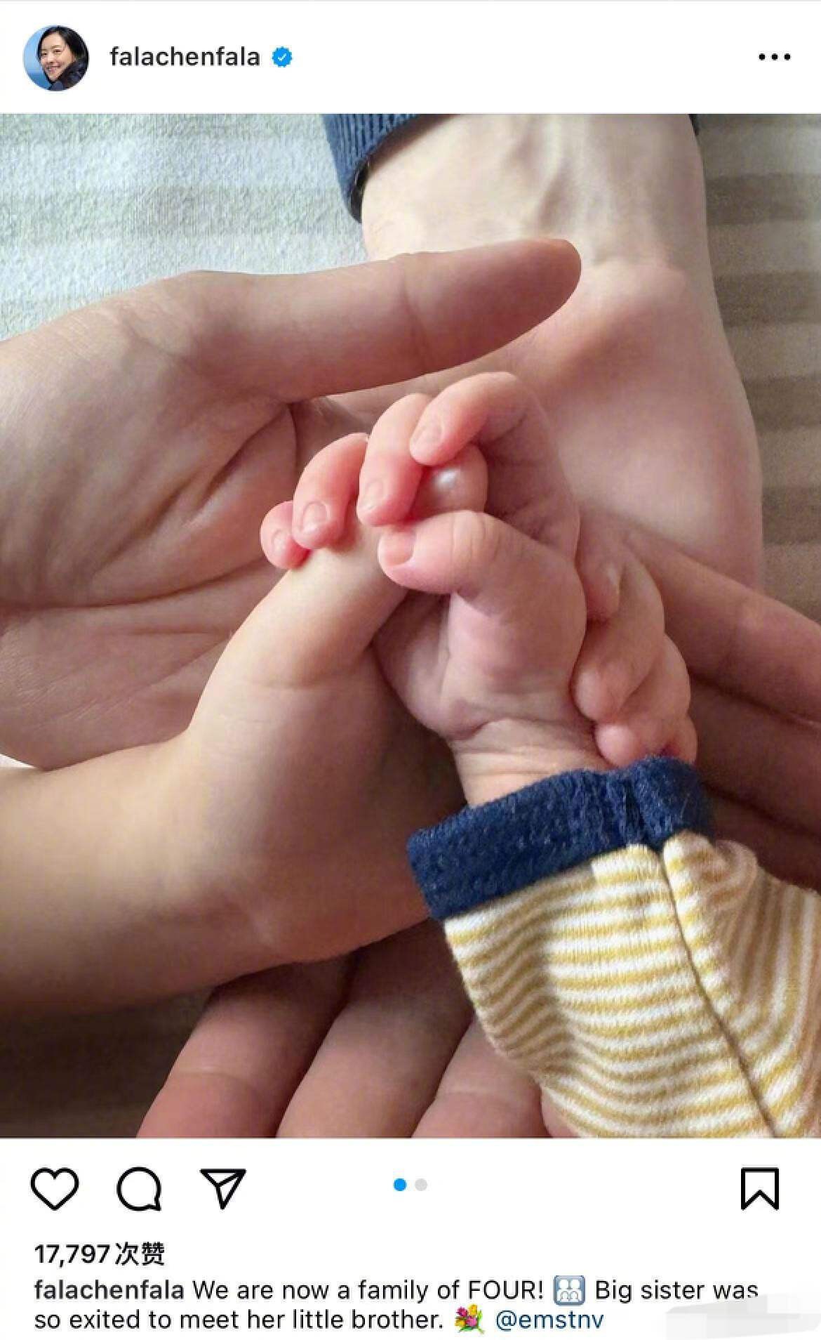 昨天,久未露面的陈法拉突然在社媒上晒出一张大手握小手的照片官宣二胎得子。