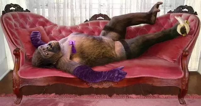 她和其他猩猩外貌上相差不大,与之不同的是,她浑身毛发被剃了个精光,头戴首饰,浓妆艳抹,腿上更是穿着双黑丝袜。
