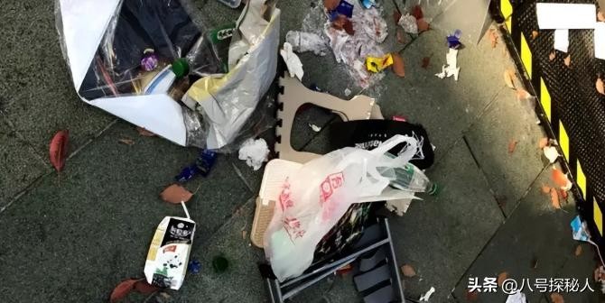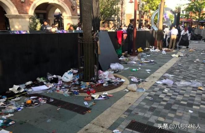 垃圾遍地,零食包装、瓶子与明星宣传页随处可见,一片脏乱。