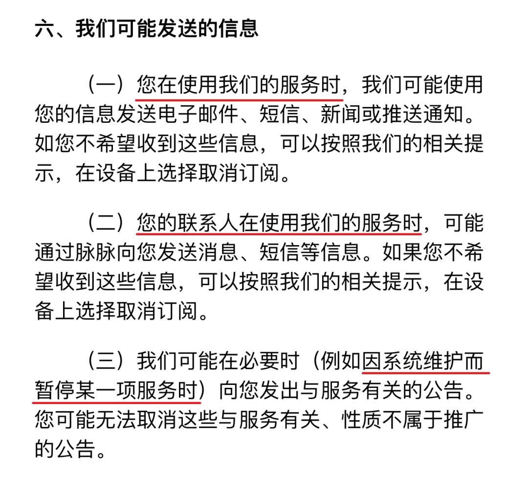 单从短信推广一项来看,在脉脉的隐私公告中可以看到,平台会在用户使用服务时、联系人使用某项服务时、系统维护等必要时候给用户发送短信。第三项可以理解,算是一种正常通知,但我可以很确认自己根本没有安装脉脉,最开始提到的陈××也是真实存在的熟人,向他确认了也没有使用脉脉!