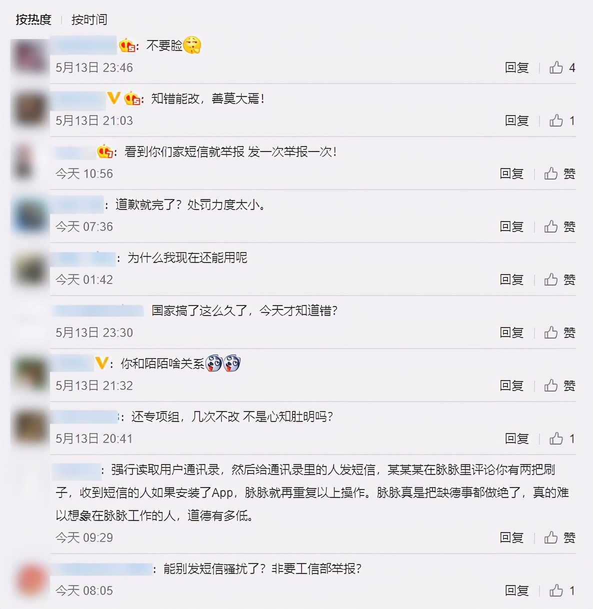 昨天晚上,脉脉官方也发声明称:将会“虚心接受批评与指正,积极进行排查及整改”,但网友普遍不买账,对脉脉获取通讯录并大面积发送推广短信的行为深恶痛绝。