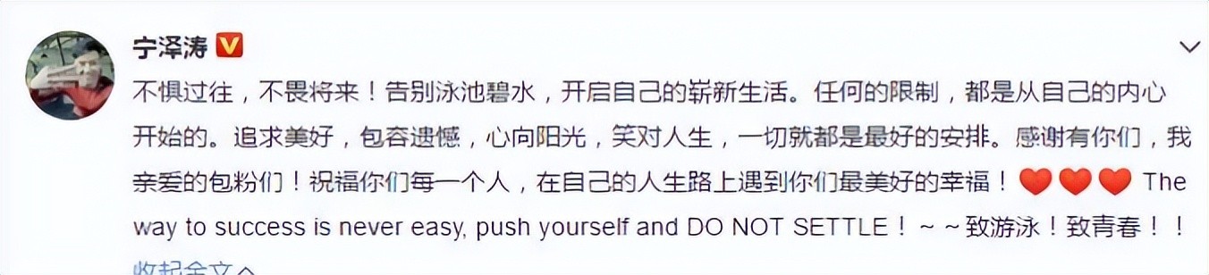 之后,宁泽涛在社交媒体上发长文告别泳池。
