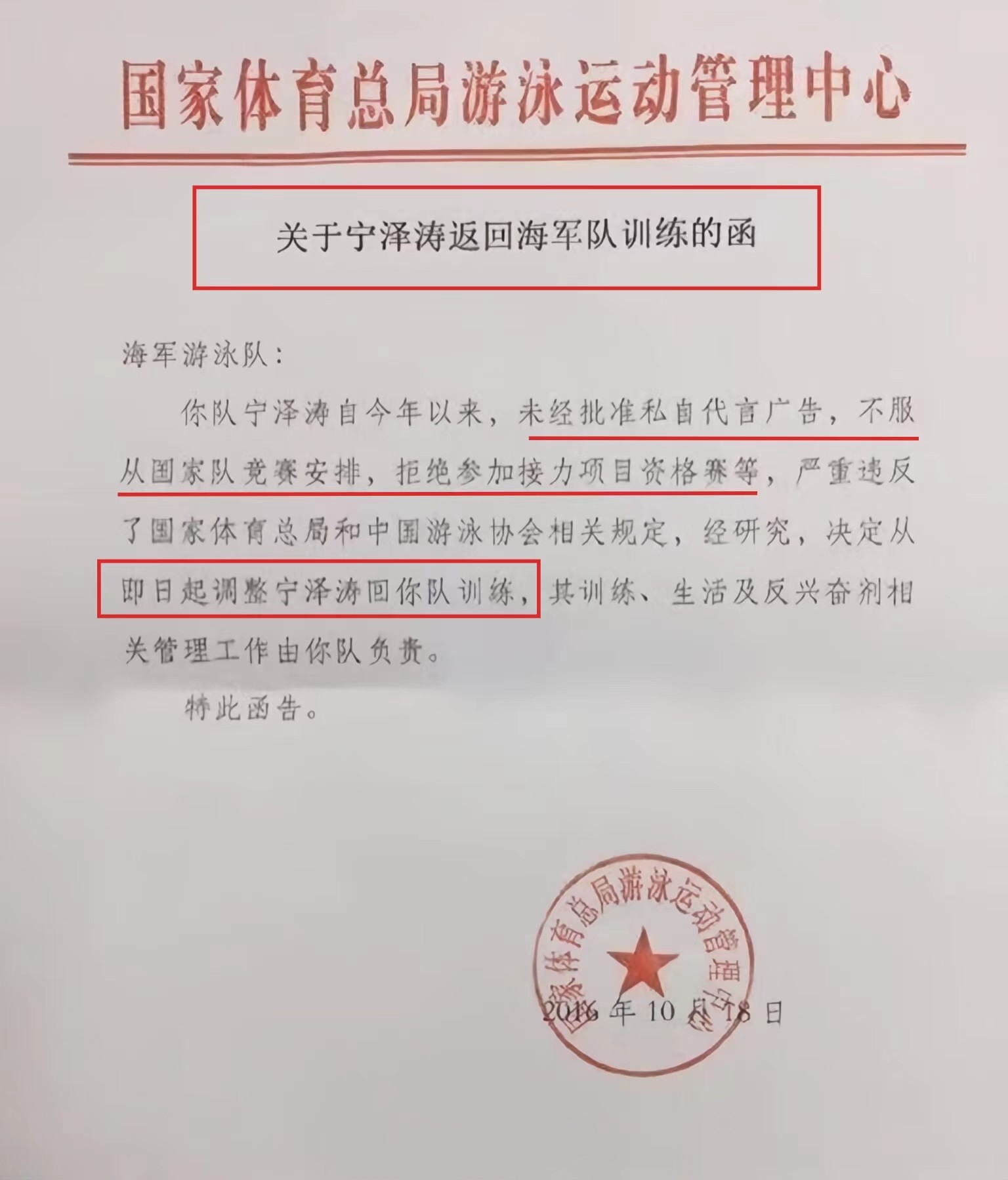 2016年,体育总局以一纸黑字将宁泽涛调回了原单位。