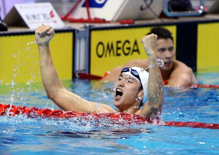 在观众热烈的加油声中,宁泽涛以第一名的成绩游到终点。