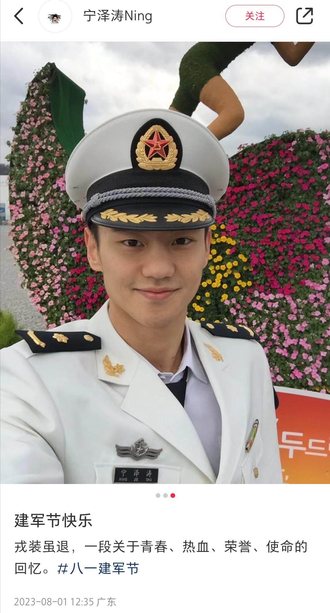 8月1日,宁泽涛在社交平台发文祝福八一建军节。