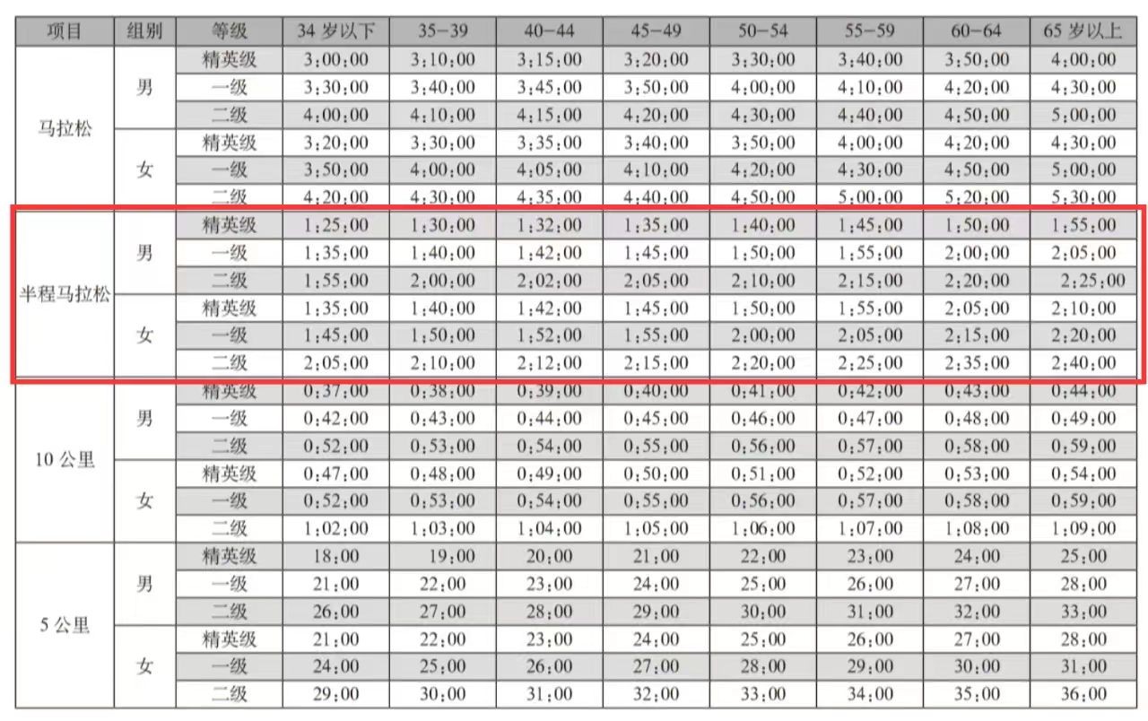 从这张表中我们可以看到基本上年龄超过39岁以上甚至更大基本半马都是超过2小时的,而35-39岁刚好是2小时达标二级水平。