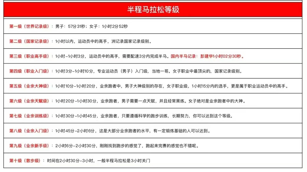 前几天我在网上我看到了一张关于半程马拉松的等级划分,2小时大概处在一个业余入门级。