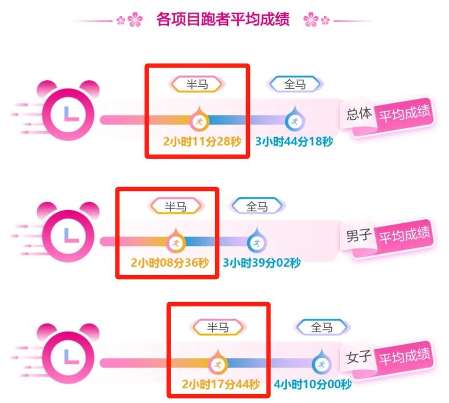 其中,男子组平均完赛成绩是2小时08分36秒;女子组是2小时17分44秒。