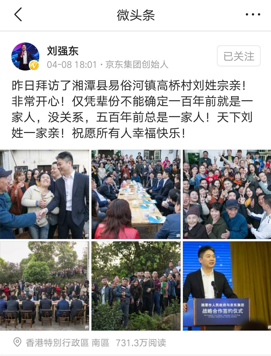 4 月 7 日下午,湘潭县易俗河镇高桥村,聚满了热情的村民。京东集团董事局主席兼首席执行官刘强东来到这里,与当地乡亲一起交流。