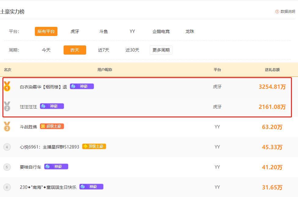 12月3日,虎牙平台知名土豪用户:汪汪汪汪,与曾经在18年被称为“最强土豪团”的烟雨楼成员之一:白衣染霜华进行了一场对赌局,双方在任意直播间比拼谁单日输出的礼物金额更高。