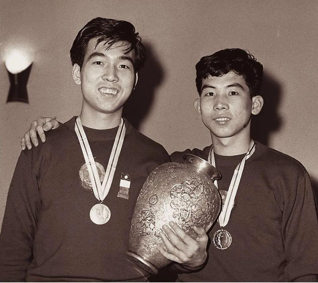 荣获第 27 届世界乒乓球锦标赛男子双打冠军的中国选手张燮林(左)、王志良