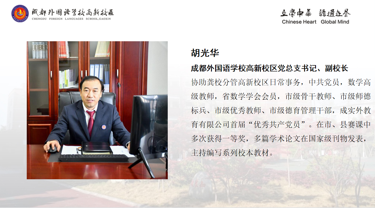 成都外国语学校高新校区作为成都外国语学校直属学校,与本部一脉相承。成实外教育集团驻派“重量级”管理团队、师资队伍协同“作战”,组建出一群“精兵强将”: