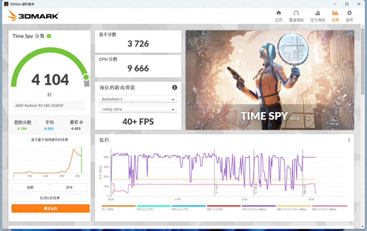 3DMark Time Spy 显卡3726分,580满血版和1060 6G分数大概在4100左右,残血版刚好弱10%左右。