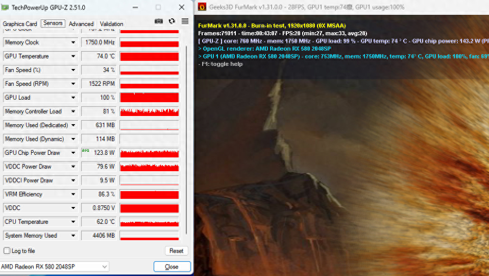 FurMark烤机40分钟,显卡温度74°(室温26°),显卡满载功耗123W左右。