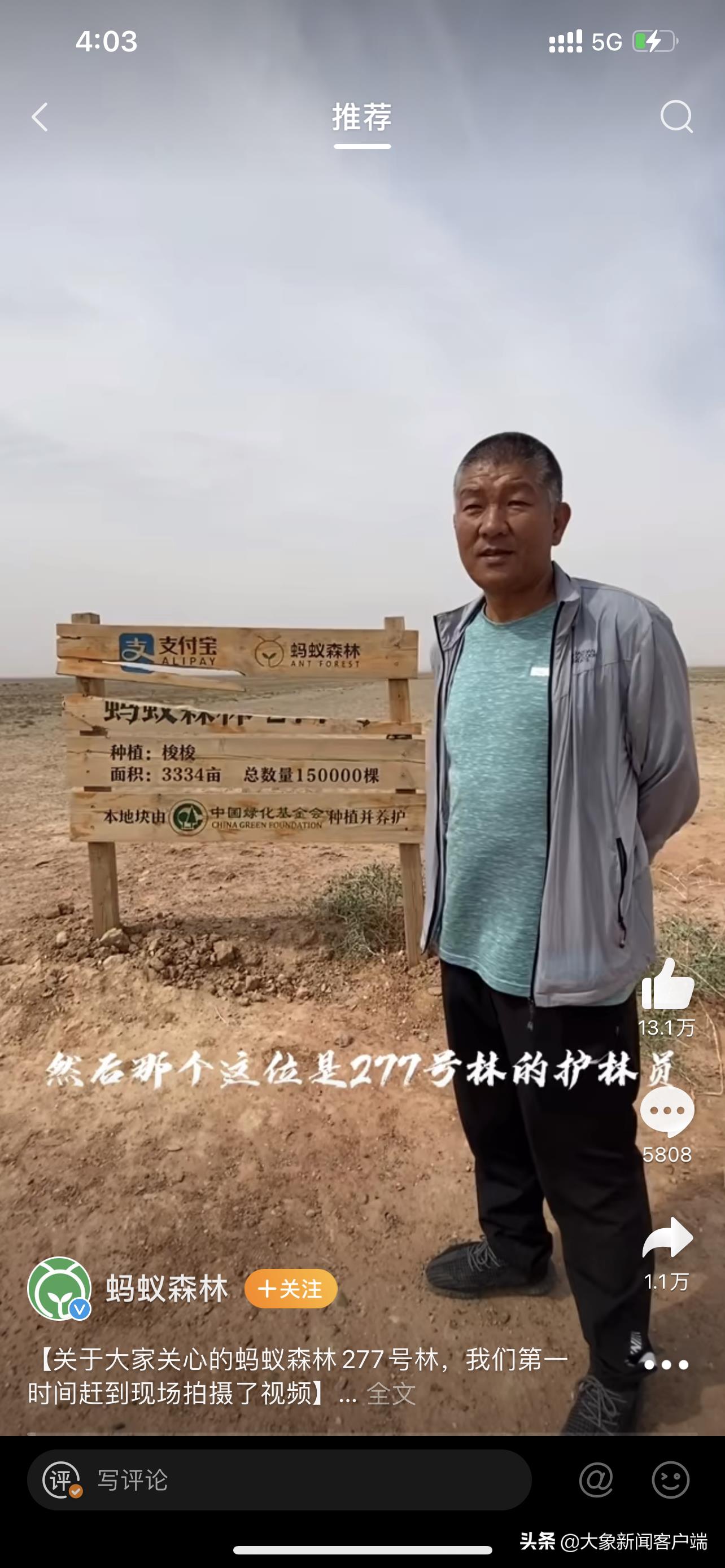视频发布后,在网上引发热议,那么在沙漠中是否按照要求栽种了梭梭呢?面对网友的质疑,9月13日蚂蚁森林发文回应称:“关于大家关心的蚂蚁森林277号林,我们第一时间赶到现场拍摄了视频。”