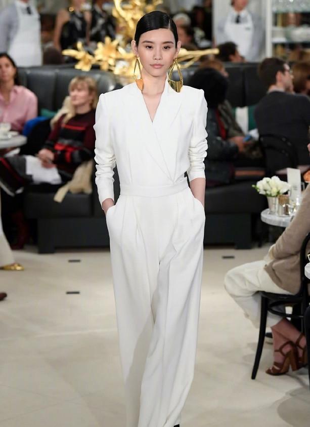身材高挑的她天生就是衣架子,这次在时装周上她选择了一身白色的连体裤,这身连体裤的穿搭更能凸显出了她那高挑的好身材,感觉是诠释了胸以下全是腿的感觉,衣领上的稍微低点的设计,则是很好的将她的锁骨间一下就呈现在人们的眼前,双手插在裤兜里的样子显得很是高冷范。