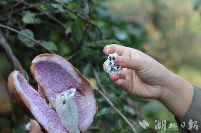 游客李女士说:“之前一直在朋友圈看朋友发的‘八月炸’,但是我自己一直没有尝过,今天终于在土关垭吃到了‘八月炸’,口感像香蕉一样,软糯香甜,比较绵密。”“八月炸”又称八月瓜、腊瓜、预知子、木通子等,其果形似香蕉,故民间又有“土香蕉”之称。农历八月间果实成熟,以果皮炸裂成两瓣仿佛“张大了嘴”的特征而得名,口感软糯香甜,富含糖、多种维生素和丰富的游离氨基酸,是一种药食两用的水果。此外,“八月炸”浑身是宝,种子可榨油,果实既能鲜食,还可酿酒、制作果酱和饮料,具有极高的经济和观赏价值。