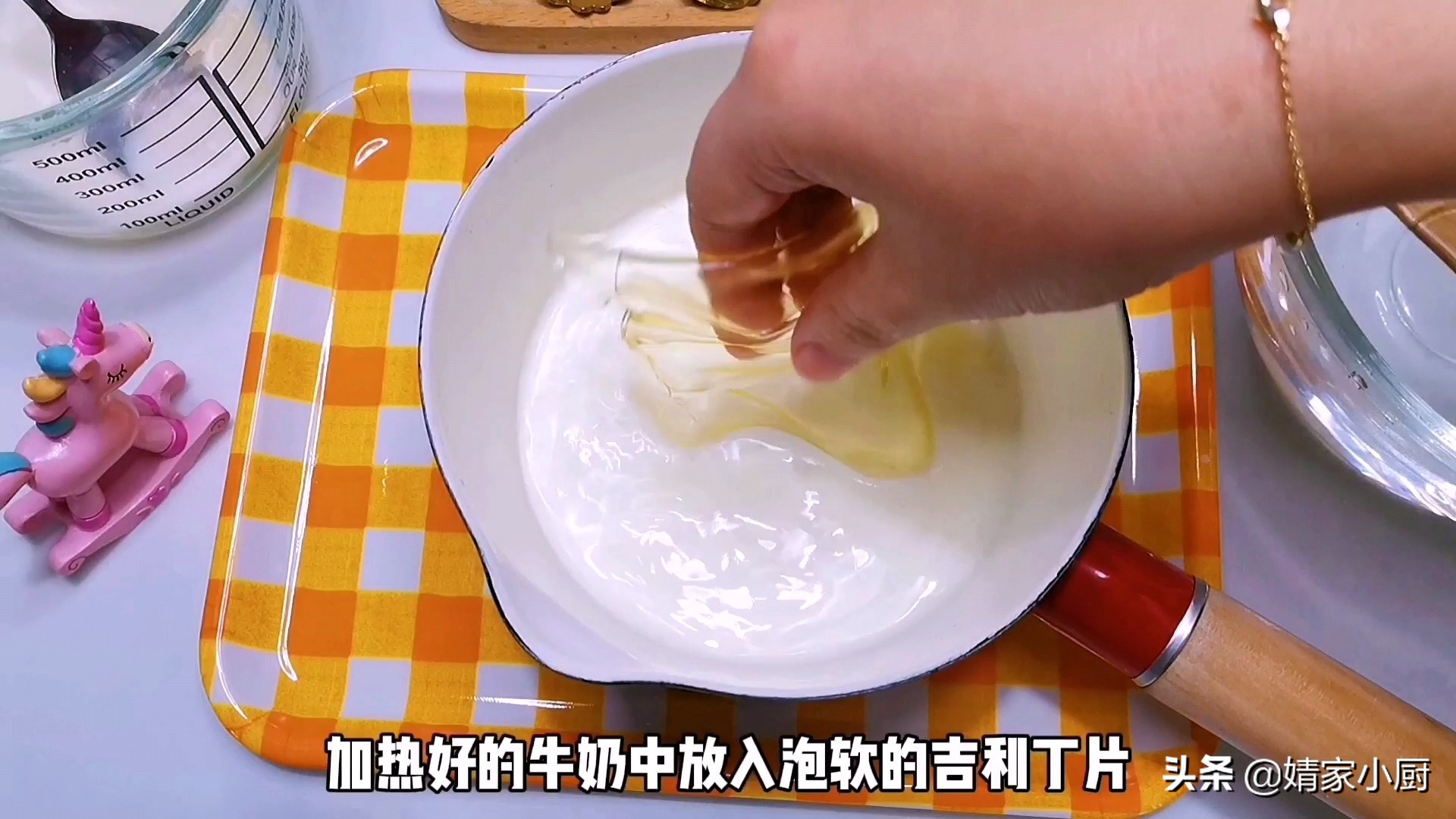 烧热的牛奶中放入泡软的吉利丁片,搅拌至吉利丁片完全融化即可。