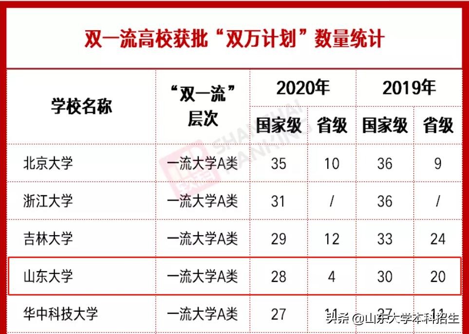 2019年4月,教育部发布了关于实施一流本科专业建设“双万计划”的通知,计划2019-2021年建设一万个左右国家级一流本科专业点和一万个左右省级一流本科专业点。截至目前,山东大学已有58个专业入选国家级一流本科专业,24个专业入选省级一流本科专业,总获批数位列双一流高校第4。