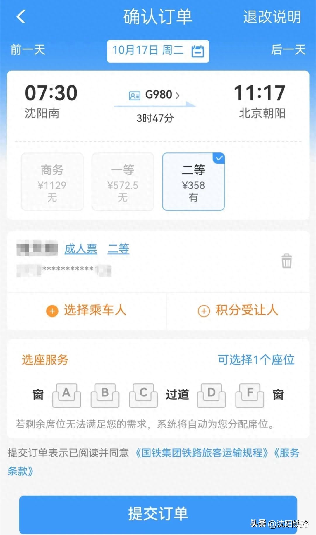 A、F是靠窗的座位,C、D是靠过道的座位,B是中间位置。目前,普速列车尚未上线选座功能。