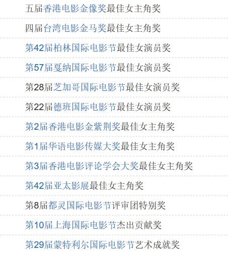 张曼玉绝对是属于影视界的一颗钻石明珠,为什么这么说呢?在她的演艺生涯中,可以说是获奖无数,称之为获奖最多的女演员也不为过(这里指的皆为有含金量的奖项),可以参照下图来看: