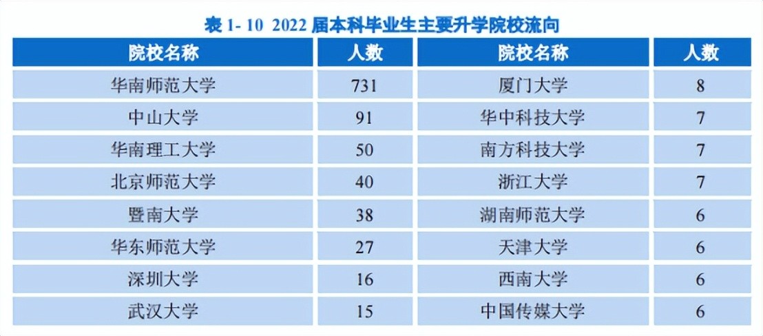 华南师范大学2022届毕业生升学人数排在前列的高校是华南师范大学、中山大学、华南理工大学、北京师范大学、暨南大学、华东师范大学、深圳大学、武汉大学、西南政法大学、华中师范大学、深圳大学、武汉大学、西南政法大学、华中师范大学、中南财经政法大学、湖南大学、南京大学、陕西师范大学、中国科学技术大学、北京大学、四川大学、中国科学院大学、哈尔滨工业大学、中国人民大学、电子科技大学、广西大学、南开大学、上海大学、东北师范大学、对外经济贸易大学、海南师范大学、华东政法大学、西南财经大学、中国政法大学等高校。
